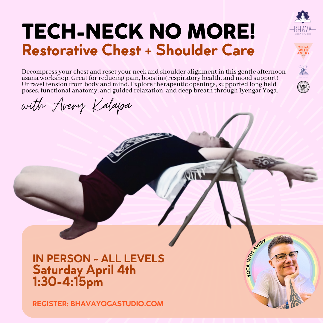 I’m Avery Janeczek Kalapa (they, them) a Level 2 Certified Iyengar Yoga Teacher, community weaver, and a queer + trans wellness organizer; eRYT500, YACEP, BFA.
